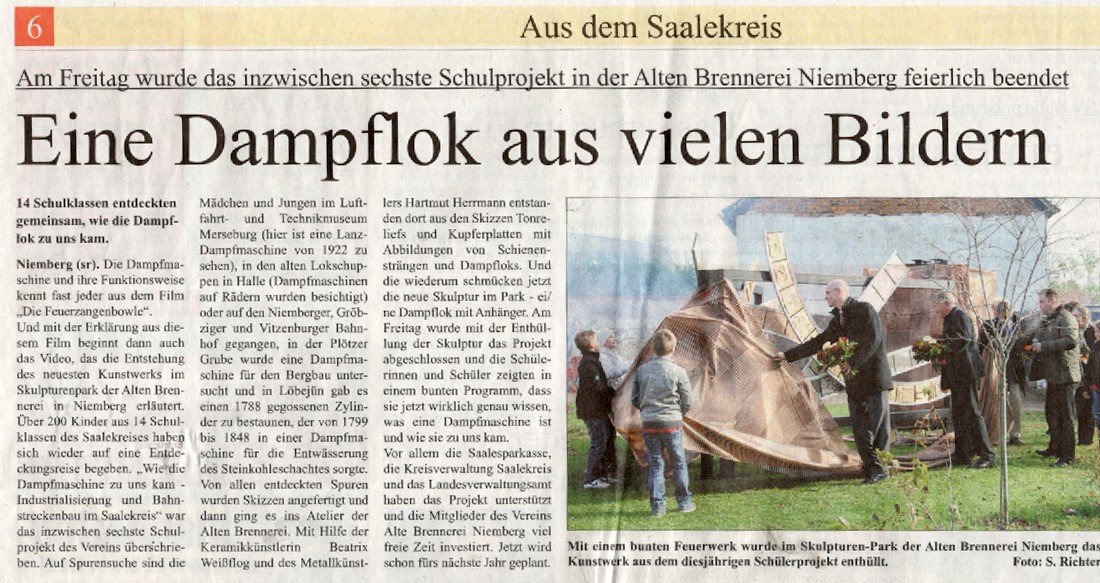 Im Rahmen dieser Arbeiten werden sich die Schüler vor der künstlerischen Ausführung intensiv mit den Gegebenheiten der Eisenbahn im 19. Jahrhundert im Saalekreis beschäftigen. Hierbei werden unter fachlicher Anleitung einzelne Bahnstrecken die sich im 19. Jahrhundert im Saalekreis befunden haben, genauer untersucht werden und Beziehungen zum heutigen Bahnstreckensystem im Saalekreis hergestellt werden. Die erarbeiteten Informationen werden sodann sowohl im Rahmen der künstlerischen Arbeiten und im Rahmen der Erstellung einer Interaktiven Karte im Internet „verarbeitet“ werden. Als Ergebnis des Projektes soll ein Model der „Saxonia “ aus Stahl und Ton mit einer Karte der Eisenbahnstrecken im Saalekreis des 19. Jahrhunderts, eine interaktive Karte im Internet und ein Kalender mit Fotos der einzelnen Arbeiten der Schüler entstehen. Das Projekt schließt sich an die vorherigen Schülerprojekte des Vereins „Alte Brennerei“ Niemberg e.V. wie „Leben vor unserer Zeit, leben in unserer Zeit“, „Architektur und (Bau)Denkmäler im neuen Saalekreis, „Nicht nur ein Punkt in der Landschaft“ und „Stationen an alten Wegen“ an.