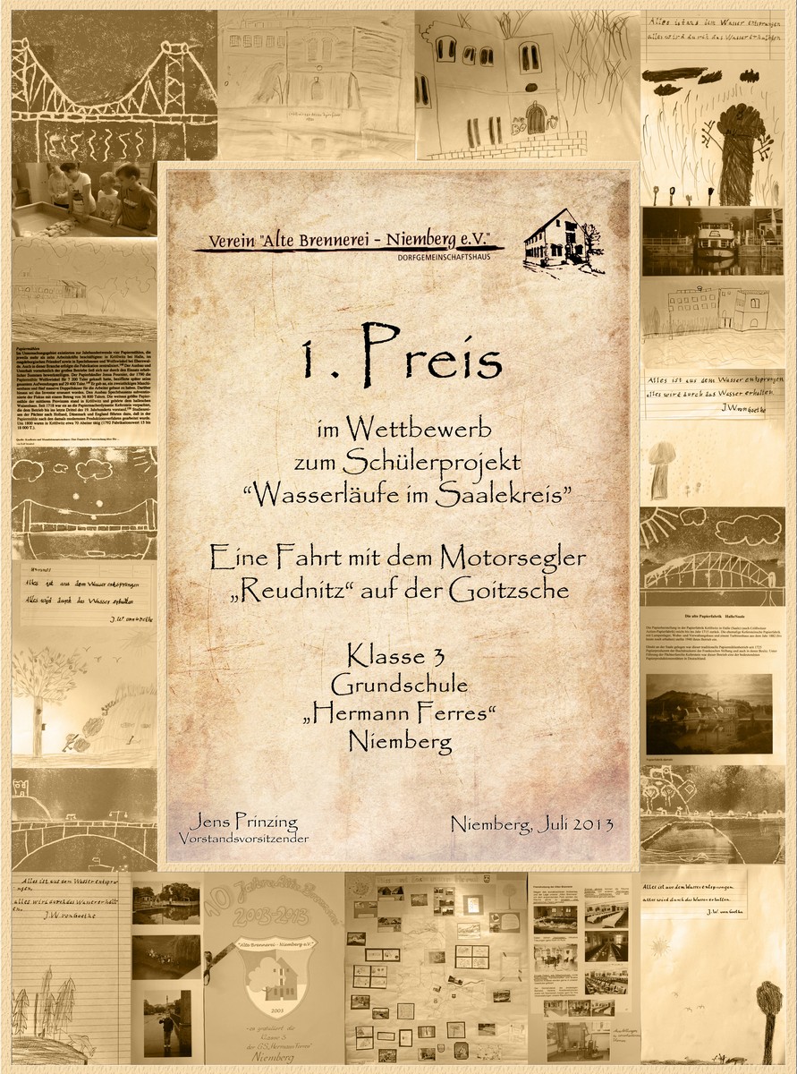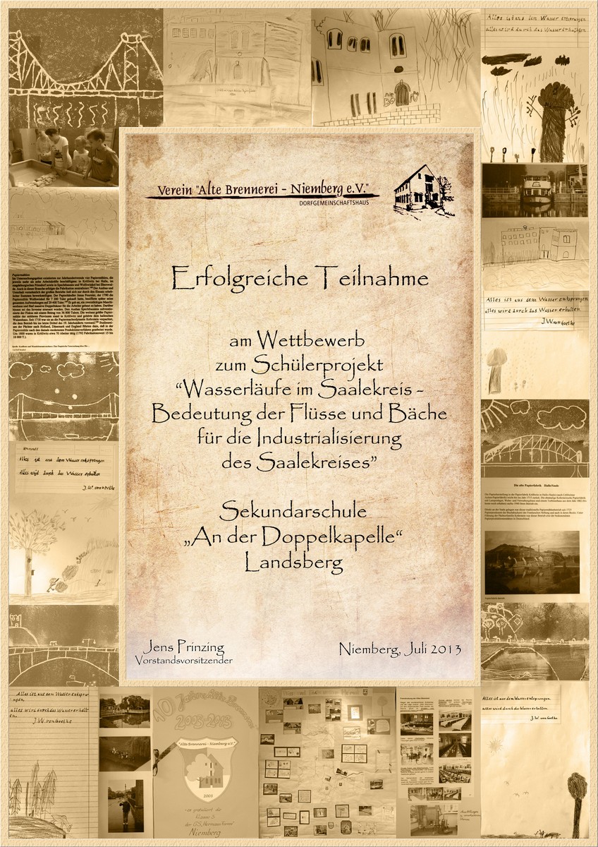 Das neue Schülerprojekt des Vereins „Alte Brennerei Niemberg e V.“ soll dazu dienen, die Schuler des Saalekreises mit der Vergangenheit des Saalekreises und die noch heute sichtbaren Spuren der sich bereist im 12. Jahrhundert entwickelnden Nutzung der Wasserwege des Saalekreises und der damit einhergehenden Infrastruktur der Bauten an den Flüssen und Bächen im Saalekreises begleitend zur schulischen Ausbildung bekannt zu machen. Die Schüler werden erfahren, dass durch das Gebiet des heutigen Saalekreises frühzeitig die Nutzung der Wasserkraft von erheblicher Bedeutung für die Entwicklung der Bevölkerung im Gebiet des heutigen Saalekreises war.